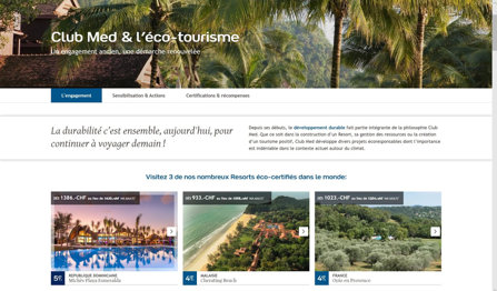 Finalement, Club Med souhaite partager sa philosophie éco-responsable au travers d’engagements concrets. Par exemple, en 2018, l’entreprise lance le programme “Bye Bye Plastique” qui vise à supprimer les objets plastique à usage unique présents dans les bars, restaurants et chambres d’ici à 2021. L’entreprise affirme également vouloir réduire le gaspillage alimentaire au sein de ses établissements et lutter contre la maltraitance animale touristique.