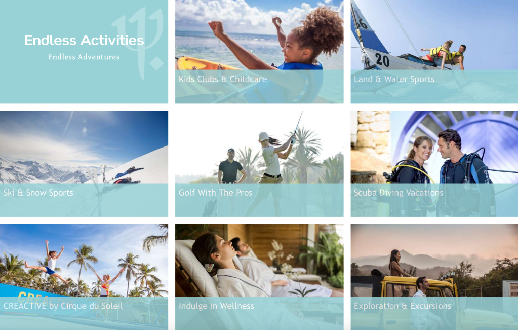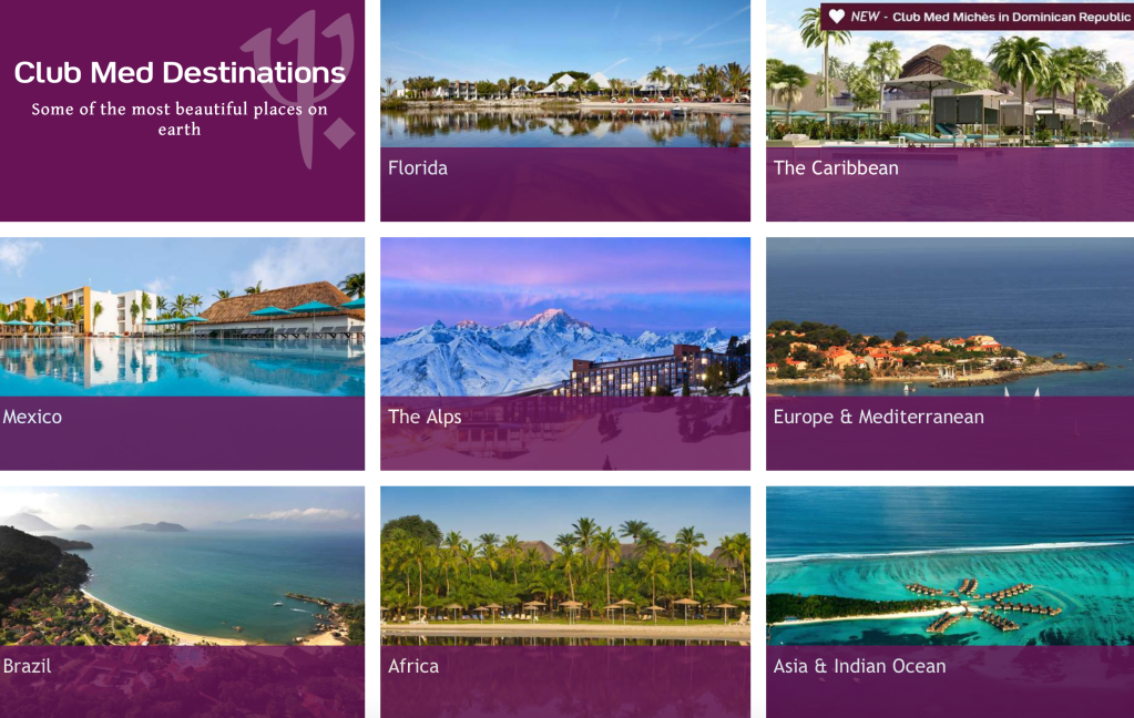Comme nous l’avons expliqué dans les paragraphes précédents, l’évolution de l’environnement démographique au cours de ces 10 dernières années a eu une influence remarquable sur les activités de l’entreprise. Les images ci-dessous illustrent les nombreux services que Club Med propose aujourd’hui à ses consommateurs. Qu’il s’agisse de destinations, d’activités ou de types de séjours, l’entreprise s’assure d’offrir un maximum de possibilités afin de répondre aux demandes d’une clientèle de plus en plus importante et diversifiée à travers le monde.